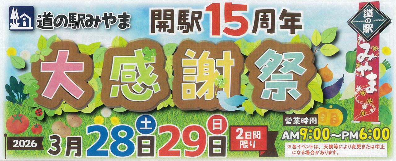 ホーム » 『道の駅みやま 開駅15周年大感謝祭』開催のお知らせ🎉